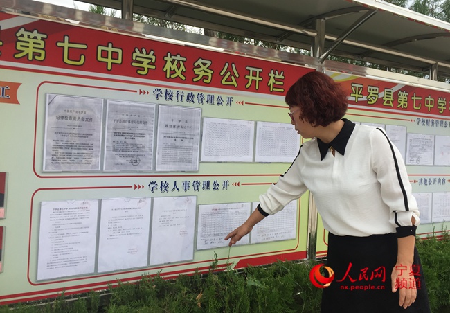 人民网银川9月7日电(穆国虎)“以前,我们想知道有关职称、绩效、津贴和评优评先的信息,只能自查自问。如今,学校通过‘一网两号三栏’主动公开公示,查询起来很方便。”近日,平罗县第七中学九年级语文老师裴泽溪对记者说,“校务公开”后,老师对校务信息“应知尽知”。